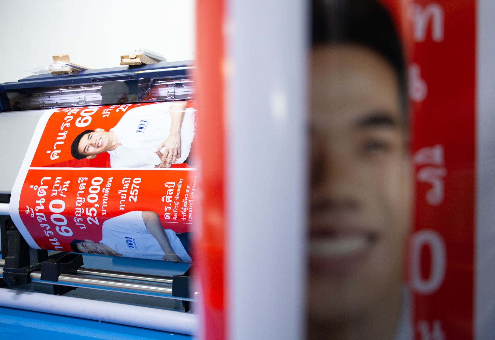 เราชิงถามด้วยความสงสัยเพราะปกติร้านรับทำป้ายหาเสียง หรือร้านพรินต์ไวนิลทั่วไปมักตั้งชื่อที่จำได้ง่าย เช่น ชื่อคน