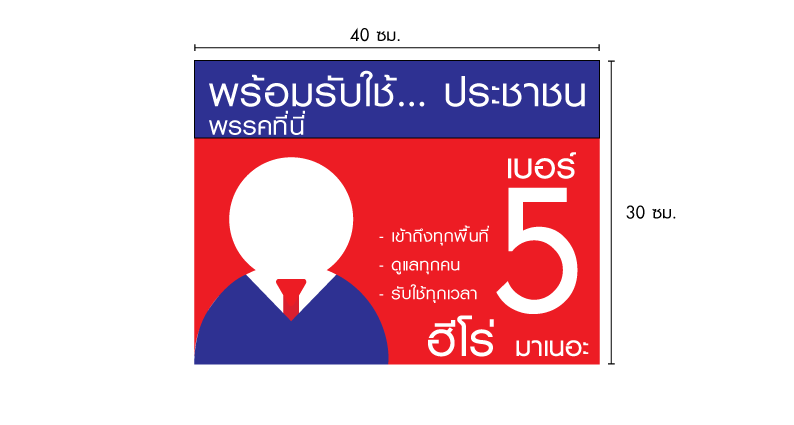 ป้ายหาเสียงขนาดนี้มีขนาดกว้าง 40 เซนติเมตร (0.40 เมตร) ยาว 30 เซนติเมตร(0.30 เมตร) ถ้าเทียบเท่าขนาดกระดาษ A4 คือกระดาษ A4 จำนวน 2 ใบติดต่อกัน หรือคือไซส์ ขนาด A3 นั่นเองครับ